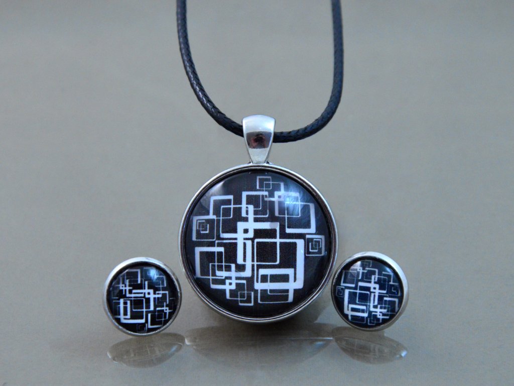 Ručně tvořená sada náušnic a náhrdelníku se skleněnými čočkami s motivem čtverečků. Puzetové náušnice mají vnitřní průměr 12 mm a přívěsek 25 mm. Přívěsek je zavěšen na černé kožené šňůrce o délce 45 cm s prodlužovacím řetízkem (5 cm) a se zapínáním na karabinku. Součástí puzetek je i kovová zarážka.