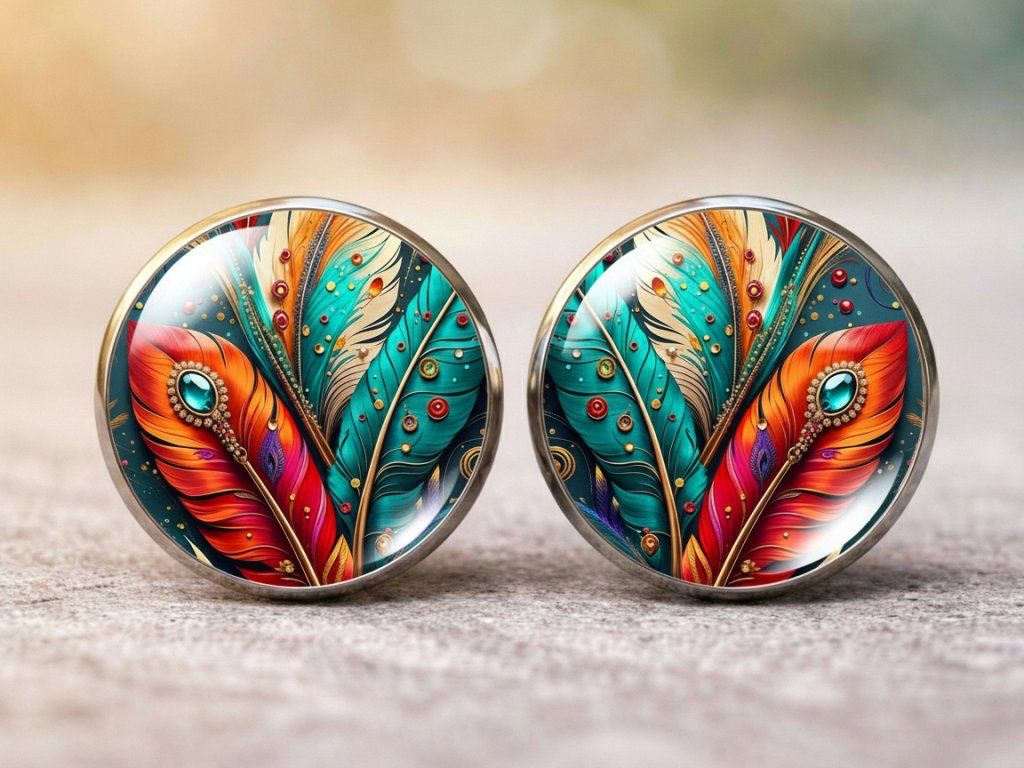 Ručně vyráběná sada šperků s kresbou barevného peří přináší originální, lehký a elegantní doplněk, který rozzáří každý outfit a potěší jako krásný dárek.