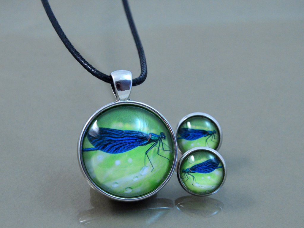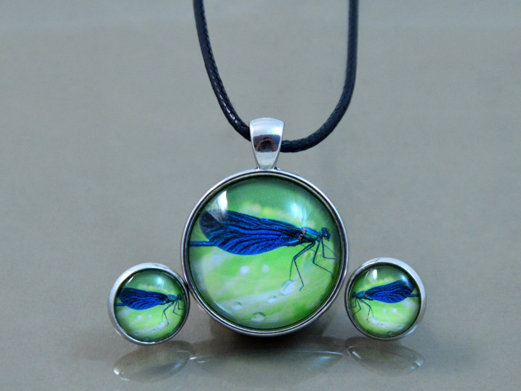 Ručně tvořená sada náušnic a náhrdelníku se skleněnými čočkami s motivem vážky. Puzetové náušnice mají vnitřní průměr 12 mm a přívěsek 25 mm. Přívěsek je zavěšen na černé kožené šňůrce o délce 45 cm s prodlužovacím řetízkem (5 cm) a se zapínáním na karabinku. Součástí puzetek je i kovová zarážka.